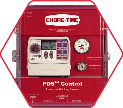 A variety of Chore-Time drinker management tools are available to help producers control their drinking systems. One unique tool is Chore-Time’s PDS™ (Pneumatic Drinking System) Control that offers poultry producers centralized control of the water pressure in all nipple drinker lines in the house.